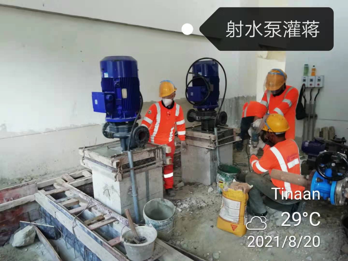 8月18日,四个工作点同时推进,办公室内装、射水抽系统安装、循环水管安装、污水池顶作混凝土。
