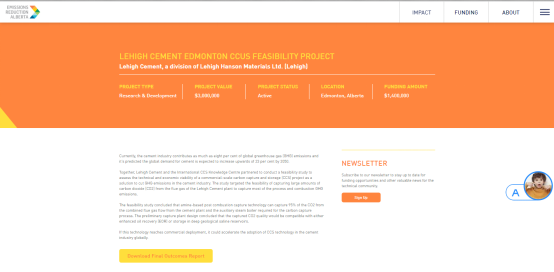 Recently, the full-scale carbon capture feasibility study for Canada LEHIGH Cement CCS Project is officially published in ERA (Emission Reduction Alberta) website, which represented Sinoma Energy Conservation Ltd (in short “SEC”) had successfully completed the “CCS Engineering Consultancy Contract”, signed with Canada CCS Knowledge Center in Dec. 2021.